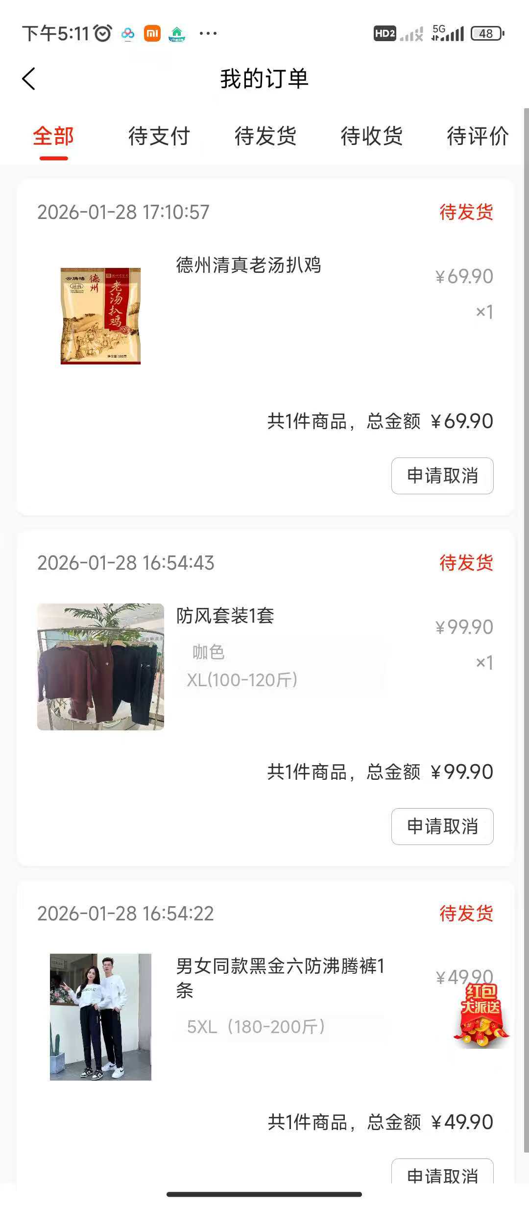 订单状态分类清晰(待支付 / 待发货 / 待收货 / 待评价)。