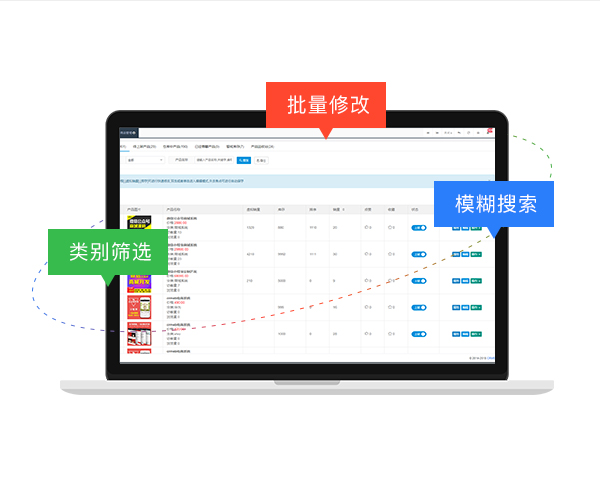 后台可通过商品状态、产品种类等筛选商品,商品可模糊查询