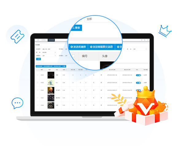 可在后台给会员批量发送优惠券、图文及站内消息